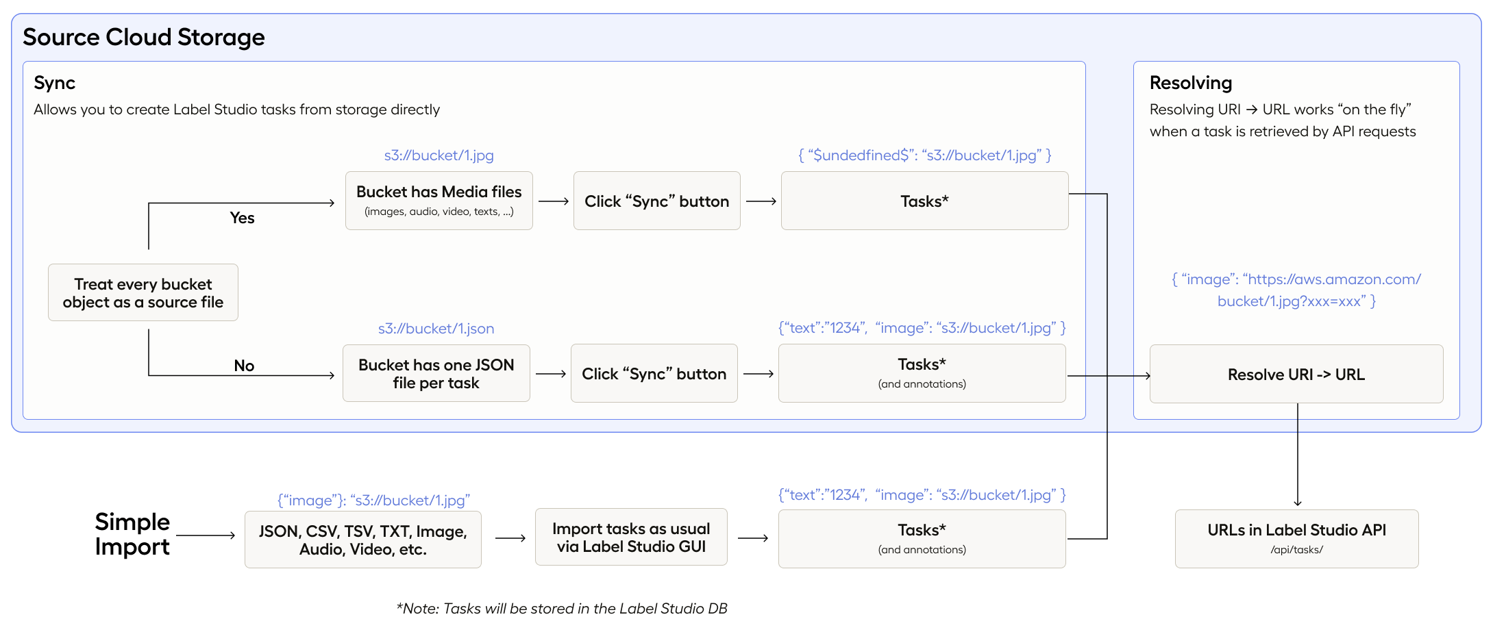 • Sync - when Label Studio scans your storage and imports tasks from it.