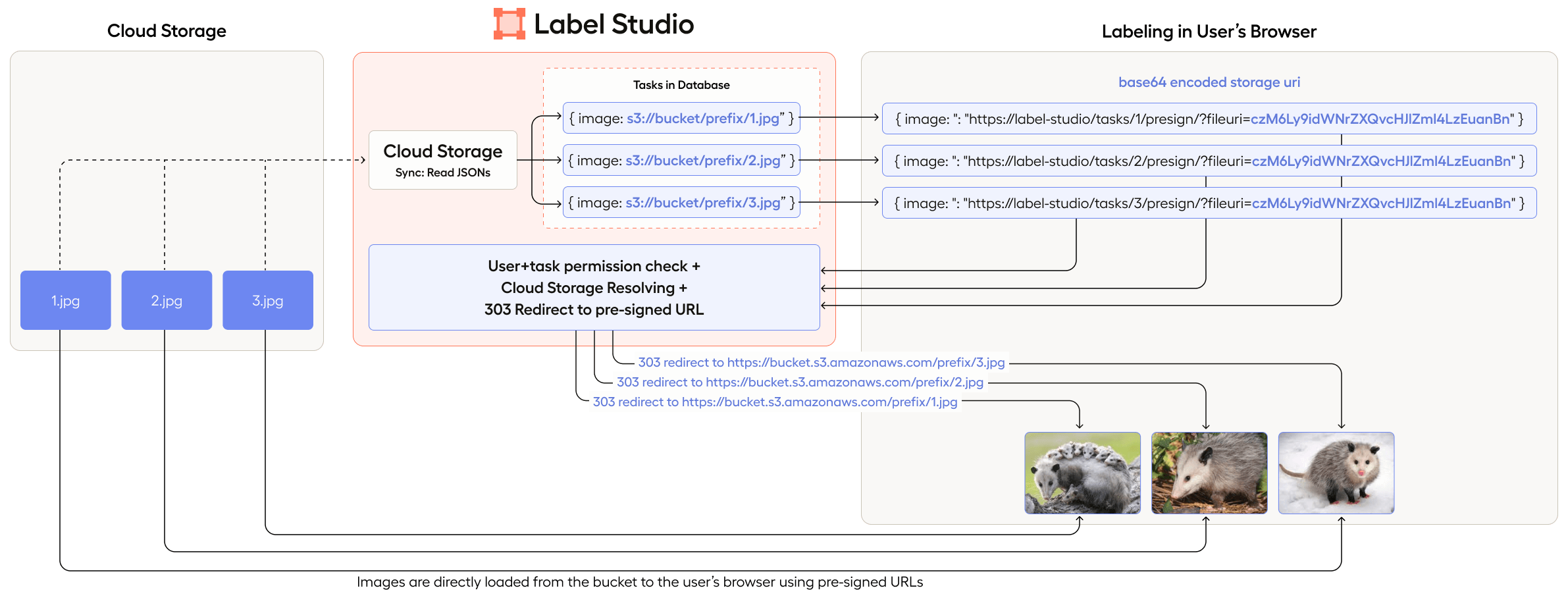 • URI resolving - when the Label Studio backend requests Cloud Storage to resolve URI links (e.g., s3://bucket/1.jpg) into HTTPS (https://aws.amazon.com/bucket/1.jpg). This way, user’s browsers are able to load media.